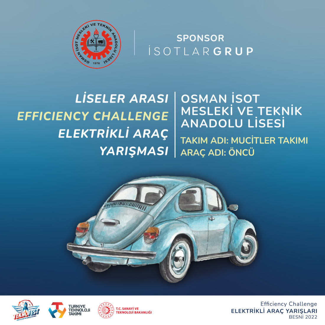 Bu yıl 5’si yapılacak olan Havacılık, Uzay ve Teknoloji Festivali Teknofest, Türkiye’nin dört bir tarafından öğrencilerin katılımıyla 30 Ağustos – 4 Eylül tarihleri arasında gerçekleştirilecek. İsotlar Grup Yönetim Kurulu Başkanı Hakan İsot tarafından Adıyaman’da Merhum Osman İsot adına yaptırılan Osman İsot Mesleki ve Teknik Lisesi öğrencileri Liseler Arası Efficiency Challenge Elektrikli Araç Yarışlarına başvurularını tamamladı.