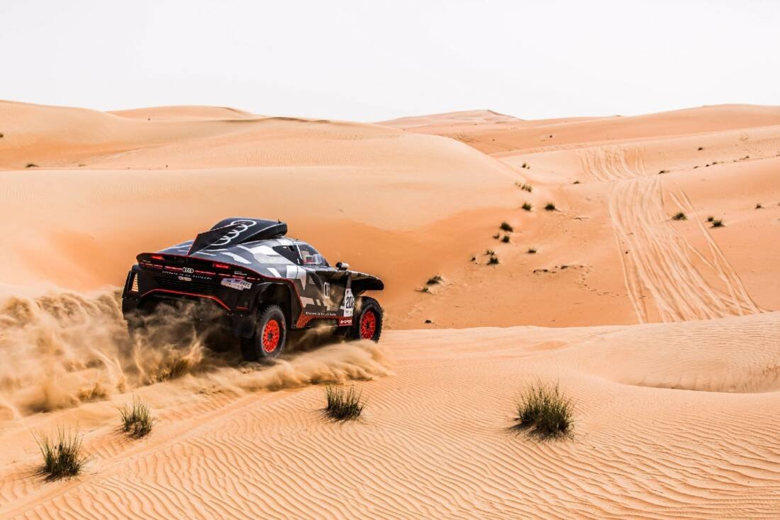 | At least two factors noticeably increased the loads: Significantly higher outside temperatures of over 40 degrees Celsius in the shade and even higher values in the desert increased the rolling resistance in the soft sand and, as expected, pushed the cooling circuits to their limits. Nevertheless, the alternative drive concept with its combination of electric powertrain with a high-voltage battery as well as the highly efficient energy converter always worked reliably. The Audi RS Q e-tron managed the entire distance without complaint. The rally also differed significantly from the Dakar Rally in terms of geology: Long and unpredictable dune passages characterized the five stages with a total length of more than 1,800 kilometers. “It wasn’t easy to find the right rhythm on the sometimes very treacherous broken dunes,” reported Stéphane Peterhansel. “Our pace was right and we didn’t take too many risks. Once again, the Audi RS Q e-tron was a lot of fun.” The example of the competition showed how complicated the terrain was: As early as on the first day, Nasser Al-Attiyah and Sébastien Loeb lost all chances of good overall results due to damage to their cars.