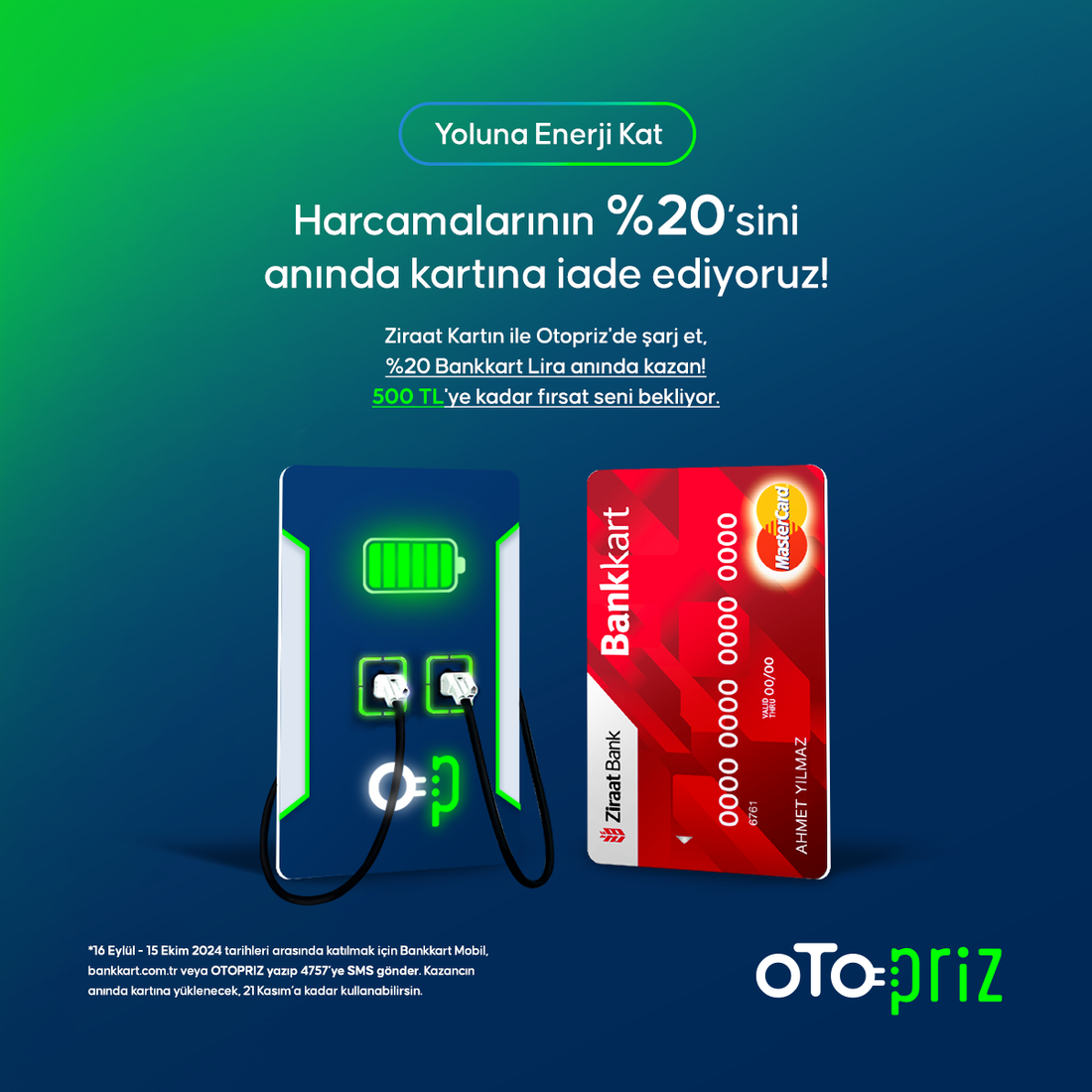 Yüzde yüz yenilenebilir enerji kaynaklarına yatırım yapan Eksim Holding’in çatısı altında Türkiye’nin her bölgesinde hizmet veren yerli ve hızlı elektrikli araç şarj istasyonu Otopriz, devreye aldığı yeni kampanya ile kullanıcılarına kazandırmaya devam ediyor. Elektrikli araç ekosistemi içindeki konumunu güçlendirmeye devam eden OtoPriz, son olarak Ziraat Bankası’nın Bankkart kullanıcılarına özel yeni bir kampanya hayata geçirdi. Bu kapsamda Bankkart kullanıcıları, OtoPriz şarj istasyonlarındaki harcamalarının yüzde 20’sini anında iade alabiliyor. 16 Eylül – 15 Ekim 2024 tarihleri arasında geçerli olan kampanya ile Bankkart kullanıcıları, OtoPriz istasyonlarındaki şarj işlemleri sayesinde 500 TL’ye kadar Bankkart Lira kazanma fırsatı elde ediyor.