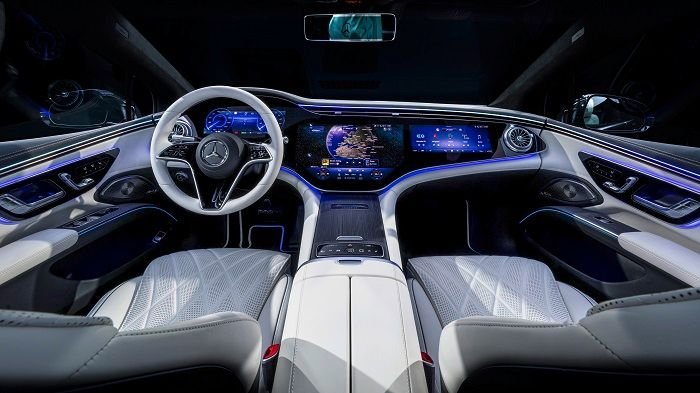 Tasarımcılar, tamamen elektrikli Mercedes-Benz otomobillerinin ayırt edici özelliği olan farlarla kusursuz birleşen koyu siyah radyatör kaplamasını (siyah panel) EQS için geliştirerek Electric Art Line’da standart olarak krom uygulamalı yeni bir radyatör paneli ile donatıyorlar. Krom detaylar ve gömme montajlı çıtalar koyu siyah çerçeve ile zarif bir kontrast oluşturuyor. Bu ızgara, ön kaputtaki ikonik metal yıldızla birleştirilerek akıllara kazınan imza Mercedes-Benz görünümünü ilk kez tamamen elektrikli bir Mercedes-Benz modeli ile buluşturuyor. Yüksek kaliteli detaylar iç mekana da yansırken B sütunlarındaki havalandırma nozulları artık galvanize kromdan yapılmış bir çerçeveye sahip ve arkadaki ek minder de Nappa deriden yapılmış şeritlerle zenginleştirilmiş durumda.