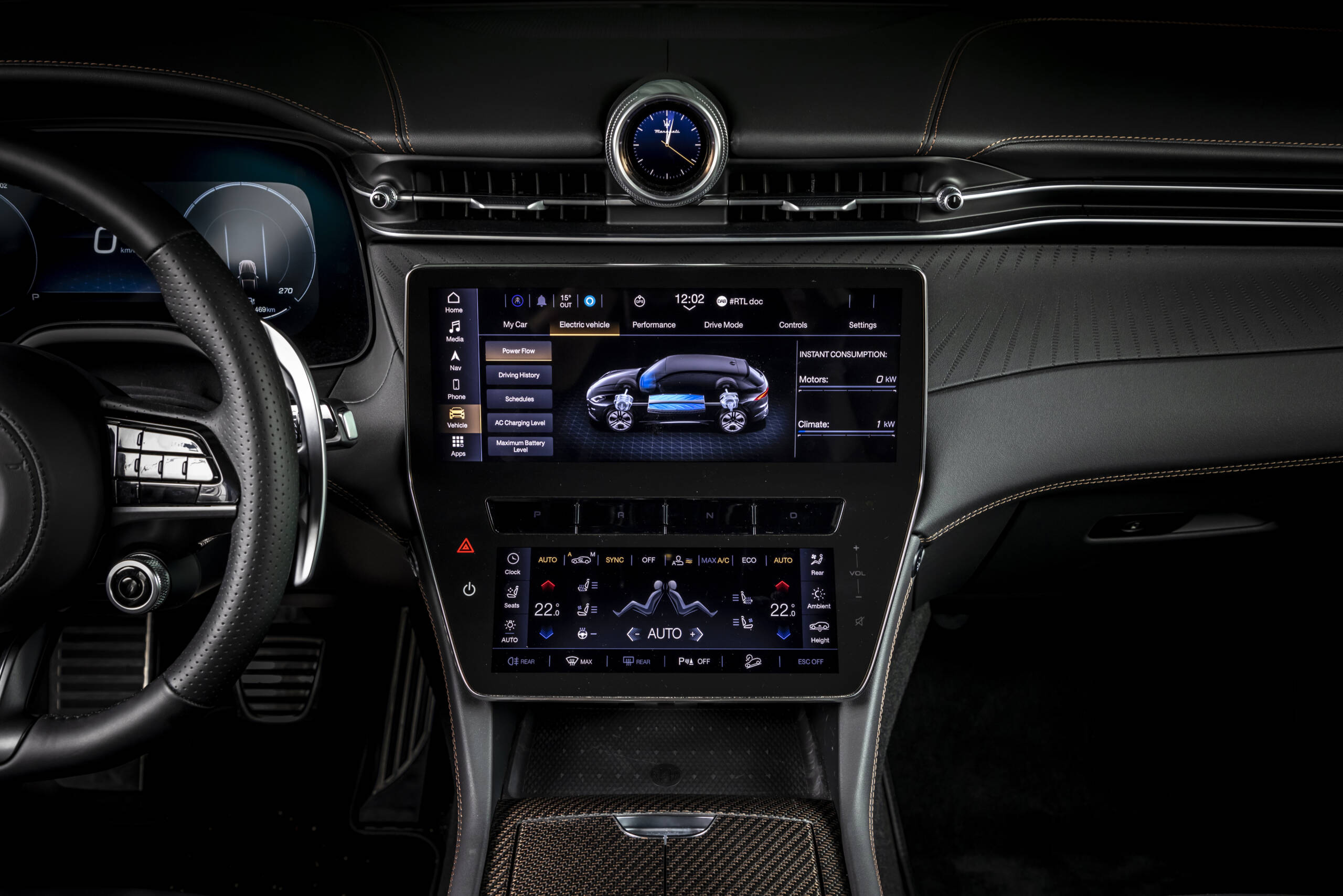 Grecale Folgore’nin iç mekân tasarımı, ön paneldeki tanımlayıcı Folgore kabartma deseni ve ambiyans ışıklarıyla vurgulanan ayırt edici karbon bakır 3D dokunmatik iç kaplamayla öne çıkıyor. Siyah ve nude 14 yönlü ECONYL® elektrikli koltuklar, yenilikçi lazer tekniğiyle birlikte ısıtmalı ve havalandırmalı özellikleriyle sunuyor. Yenilikçi rejenere iplik aynı zamanda tavan kaplamasına ve halıya karakteristik bir özellik katıyor. Grecale Folgore ile teknoloji, araç içi keyifte de devam ediyor. Duygulara hitap eden sistemlerde dijital arayüzler sürücüye göre uyarlanıyor. Hem 12,3″ merkezi ekran, hem de 8,8″ konforlu ekran, kontrollere erişimi kolaylaştırmak için ergonomik olarak konumlandırılıyor. Grecale Folgore, aynı zamanda hızlı ve kolay dijital iklim kontrollerine sahip. Maserati’ye özel yeni hızlı hareket kontrolleri, gözleri yoldan ayırmadan sıcaklık ve fan hızı üzerinde anında kontrol sağlıyor.