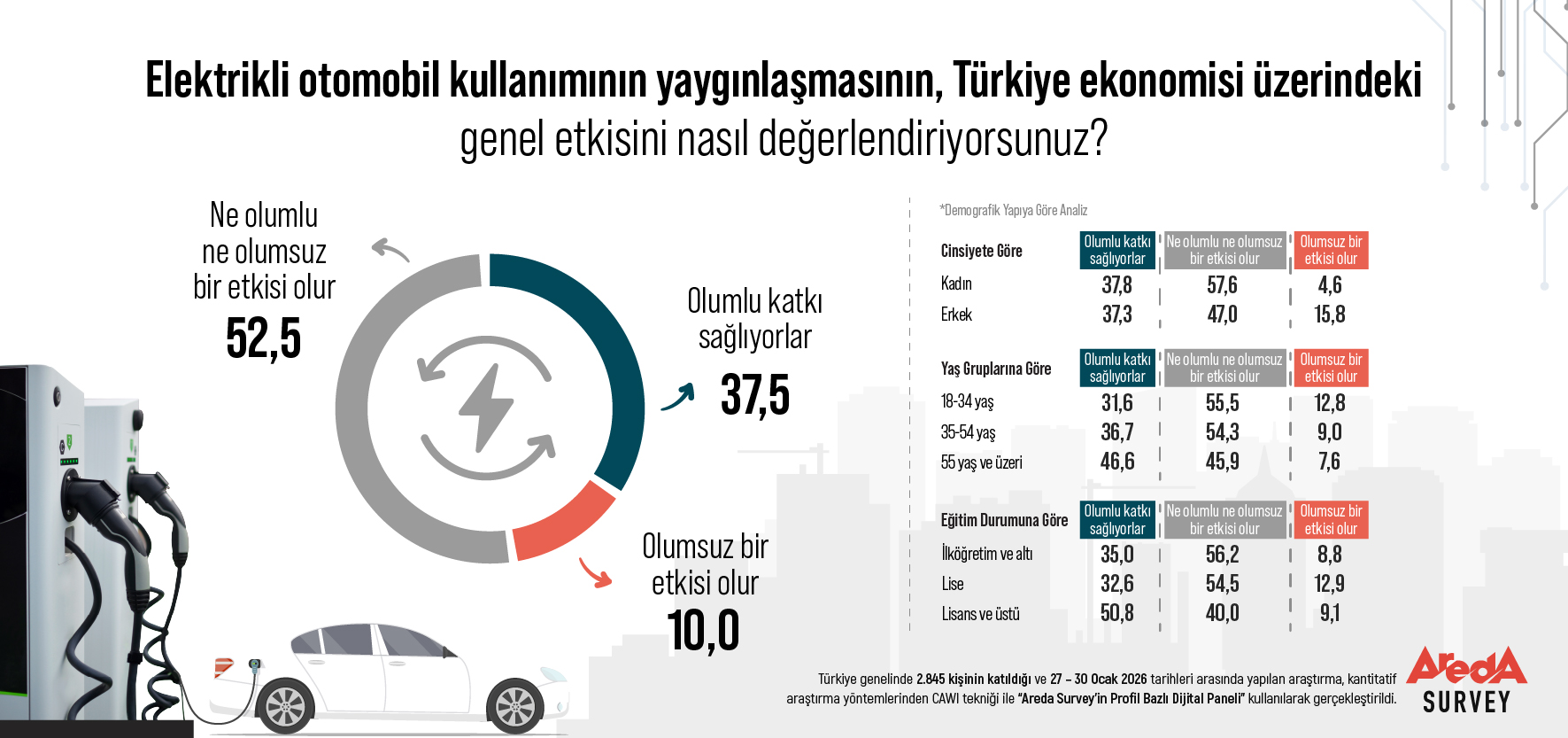Areda Survey’in Sosyometre-Ocak 2026 araştırmasına göre toplumun yüzde 52,5’i elektrikli otomobillerin Türkiye ekonomisine ne olumlu ne olumsuz etki yapacağını düşünüyor. Olumlu katkı bekleyenlerin oranı yüzde 37,5’te kalırken, erkeklerde olumsuz beklenti yüzde 15,8’e çıkıyor.
