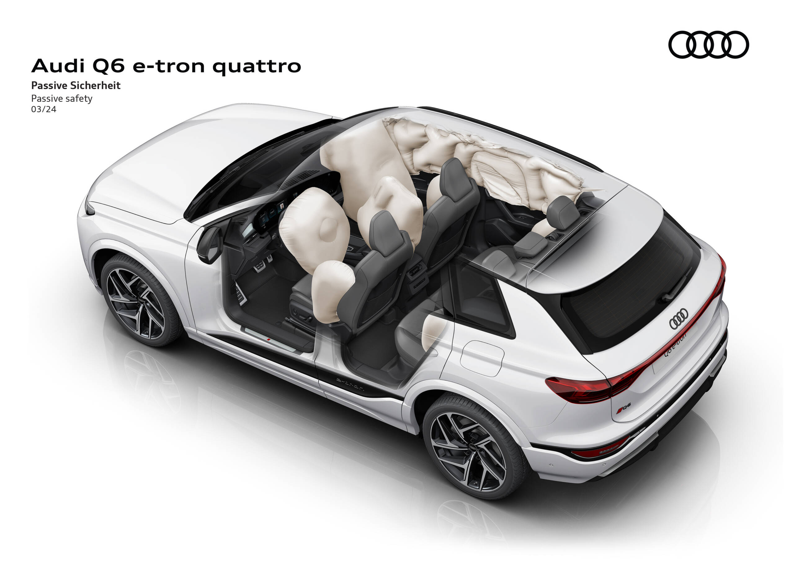 Ön bölge çarpışmalarında yolcu hem sürücü hem de yolcunun tüm kritik vücut bölgeleri için iyi bir koruma sağlayan Q6 e-tron yan bariyer testlerinde de sürücü ve yolcuların tüm kritik vücut bölgelerinin korunmasında başarılı sonuçlar ortaya koydu ve maksimum puan aldı. Ön koltuklar ve baş destekleri üzerinde yapılan testler, arkadan çarpma durumunda yaralanmalara karşı iyi bir koruma sağladığını gösterdi.