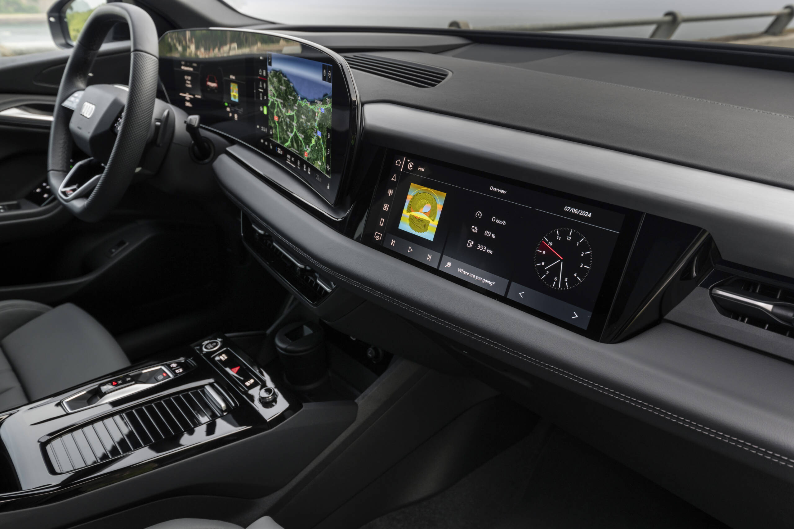 Yeni elektronik mimari ile kullanıcılar araçta dijitalleşmeyi her zamankinden daha fazla deneyimliyor. Audi MMI panoramik ekran ve MMI ön yolcu ekranı ile bir Dijital Sahne iç mekanı süslüyor. Açıkça gruplanan ekranlar tasarım konseptine tam olarak entegre edilmiş durumda ve iç mekâna ferah ve havadar bir his katıyor. 11,9 inç Audi sanal kokpit ve 14,5 inç MMI dokunmatik ekrandan oluşan zarif ve açıkta duran Audi MMI panoramik ekran kavisli bir tasarıma ve OLED teknolojisine sahip. Sürücünün kontrol alanı eğimli bir tasarıma sahip ve ekranın kavisli şekli sürücüyü sarıyor. Ayrıca Kavisli Ekranın şekli Audi’nin tipik Singleframe tasarımını andırıyor. Ambiyans aydınlatma kavisli ekranın karanlıkta havada süzülüyor gibi görünmesini sağlıyor. Ön konsol tasarımına mükemmel bir şekilde entegre edilen ve Audi’de ve premium orta sınıfta ilk kez kullanılan 10,9 inç MMI ön yolcu ekranı ön yolcuların dijital sahnesini tamamlıyor.