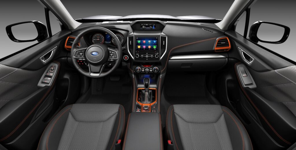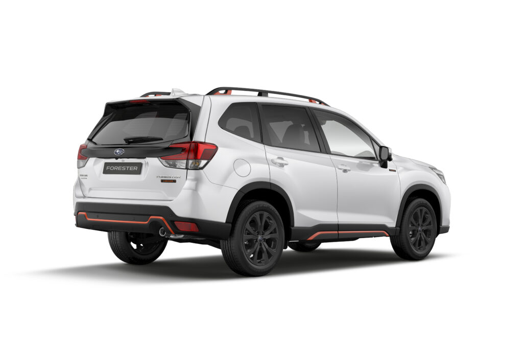 Ön, yan ve arka tampon kaplamaları üzerinde e-Xclusive ve e-Xtreme modellerinde yer alan gri renkli koruyucuların yerine, siyah kaplamalar üzerinde “red-orange” turuncu tasarımlı şeritler kullanılıyor. Yine tavan raylarının bağlantı noktalarında turuncu kaplamalara yer verilmiş. Kabin içindeki koyu gri renkli parçalı deri/kumaş kaplamalar turuncu dikişlere ve vurgulara sahip. Forester Sport’un iç mekanında havalandırma ızgara kapaklarından, orta saklama bölmesine kadar birçok turuncu renkli dikkat çekici, sportif detay yer alıyor.