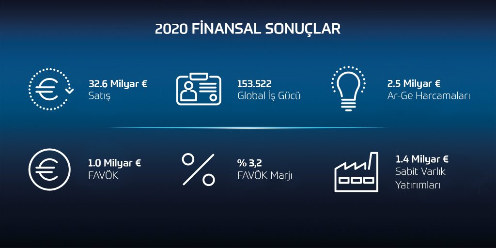 Düzeltilmiş FAVÖK 1,047 milyon Avro olarak gerçekleşti (2019: 1.503 milyon Avro); düzeltilmiş FAVÖK marjı yüzde 3,2’ye düştü (2019: yüzde 4,1). Şirket birleşmeleri ve satın almaları için düzeltilmiş serbest nakit akışı 994 milyon Avro (2019: 803 milyon Avro) olarak gerçekleşti. Eksi 741 milyon Avroluk vergi sonrası net kâr, esasen yeniden yapılandırma hükümlerinden ve ZF’nin katı maliyet disiplinine rağmen sürdürmek istediği gelecekteki görevler için önemli ön harcamalardan kaynaklanmaktadır.