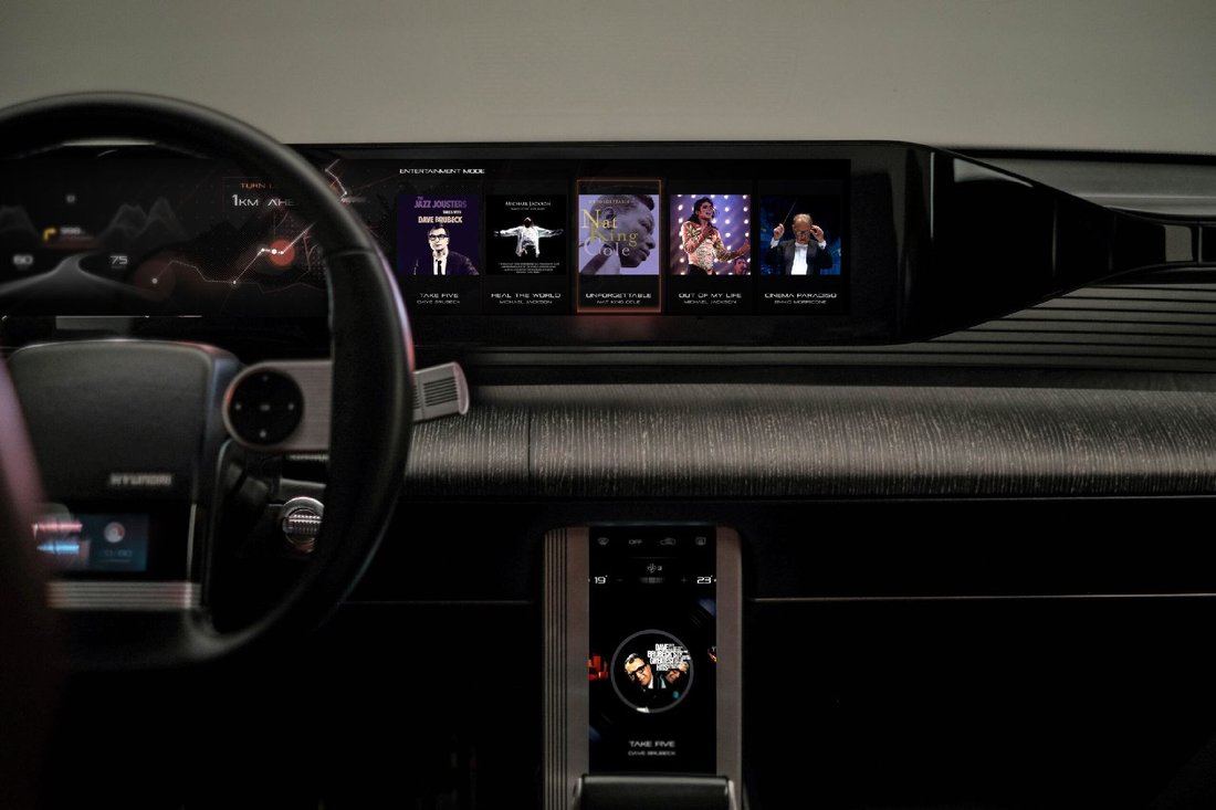 Gösterge panelindeki kadranları ve düğmeleri ultra geniş olarak kullanan tasarımcılar, dokunmatik özellikli düz ekrana da yer vermişler. Tek kollu direksiyon simidi ve uçaklardaki gaz koluna benzer vites koluyla da 80’lerin havasını koruyan Hyundai tasarımcıları, dijital gösterge panelinin sol ve sağ uçlarından başlayan bronz renkli ışık huzmesini de kabinin çevresine doğru yaymış. B sütunlarına nüfuz eden bu ambiyans aydınlatması, iç mekana göz alıcı bir renk katıyor ve daha geniş bir alan hissi uyandırıyor.
