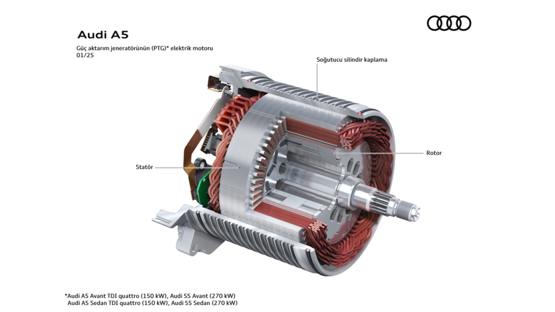 Ekstra güçlü bir tahrik modülü,Bir diğer önemli avantaj ise MHEV plus sisteminin performansı ve sürüş konforunu artırması. Yeni MHEV plus sistemindeki kompakt fakat güçlü elektrikli tahrik modülü olan güç aktarma jeneratörü (PTG), bu iyileştirmede kilit rol oynuyor. Bu bileşen, Audi’nin daha önce sunduğu ve yalnızca kayışlı alternatör marş motoruyla çalışan MHEV teknolojisinden farklı. PTG, entegre güç elektroniğiyle birlikte şanzımanın çıkış mili üzerine doğrudan monte edilen kompakt bir ünitede yer alıyor ve sürüşe 18 kW (24 PS) elektrik gücüne kadar katkıda bulunabiliyor. Modül, araç çalıştırıldığında zaten tahrik torku olarak kullanılabilen, şanzıman çıkışında maksimum 230 Nm tork sağlama kapasitesine sahip.