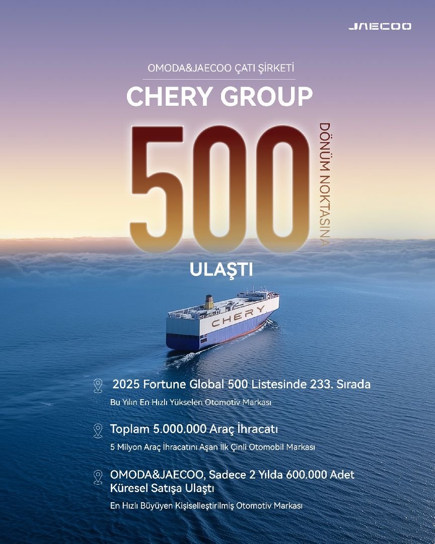 Chery Grubu ise Temmuz 2025 itibarıyla toplamda 669.300 araç ihracatı gerçekleştirdi. Grup bu rakamla Çinli otomotiv markaları arasında ihracat liderliğini sürdürürken, her 27 saniyede bir Chery aracı dünya pazarına gönderildi. Bugün itibarıyla Chery, dünya genelinde 17,18 milyon kullanıcıya, Çin dışında ise 5,17 milyon kullanıcıya hizmet veriyor.