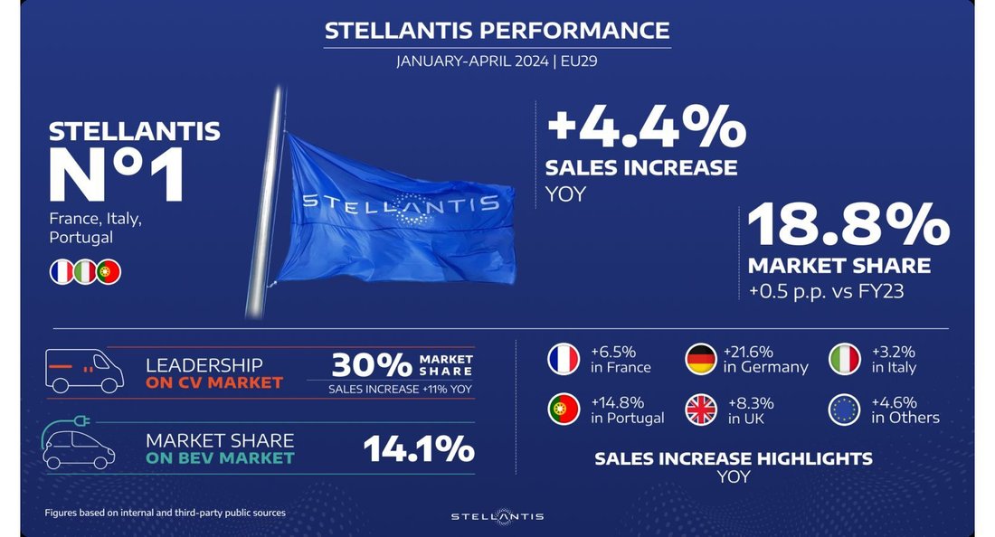 Stellantis Pro One Commercial Vehicles business unit keep its market leadership on a YTD basis with a share of nearly 30% and a year-over-year volume increase of 11%. This performance extends across Europe, showcasing steady growth in almost all countries and an outstanding April triple-digit sales growth in Portugal (+101%).