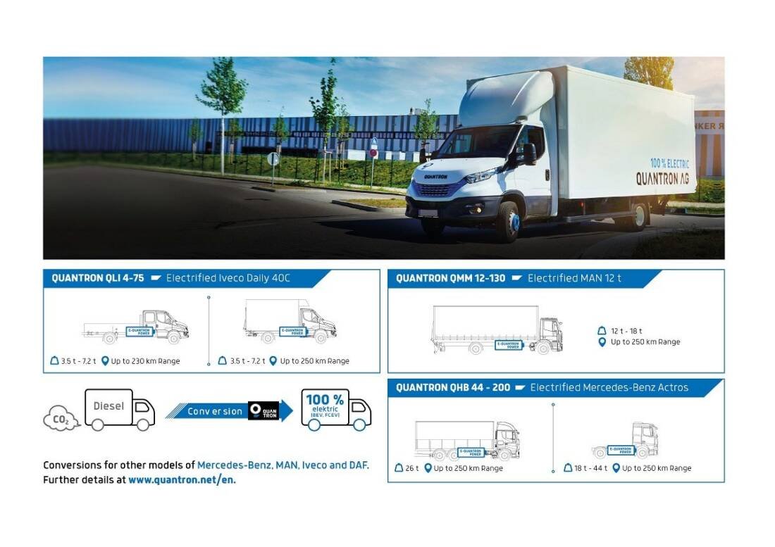 In view of the ambitious climate targets, a comprehensive transformation of freight transport is unavoidable to reduce emissions. To support companies on this path, the German Federal Ministry of Transport and Infrastructure has announced that it will promote the change to commercial vehicles with alternative drive systems. Specifically, this involves up to 80% of the additional investment costs compared to diesel vehicles. As a full range supplier of climate-friendly commercial vehicles from 3.49 to 44 tons, Quantron AG is the ideal contact for new e-vehicles and for the electrification of existing vehicles.